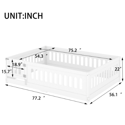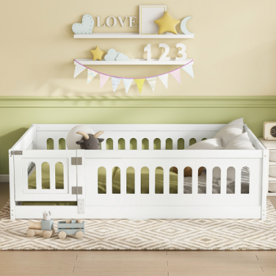 Product Name:Full Size Floor Bed with Heightened Safety Guardrails and Door, Solid Wood Bedframe with Rails for Girls, Boys, Teens, Child Bedroom, Kids Playroom, No Slats Included, White