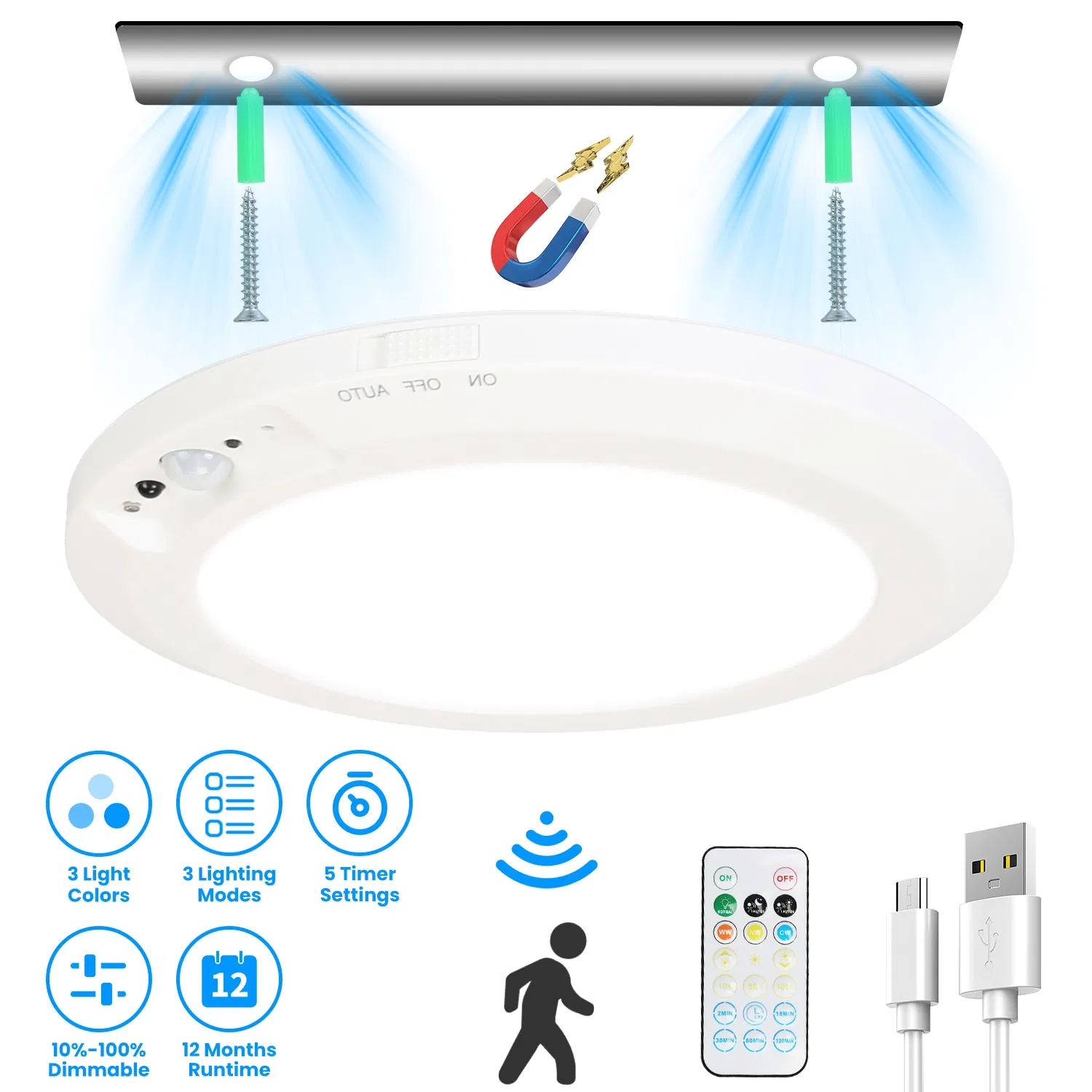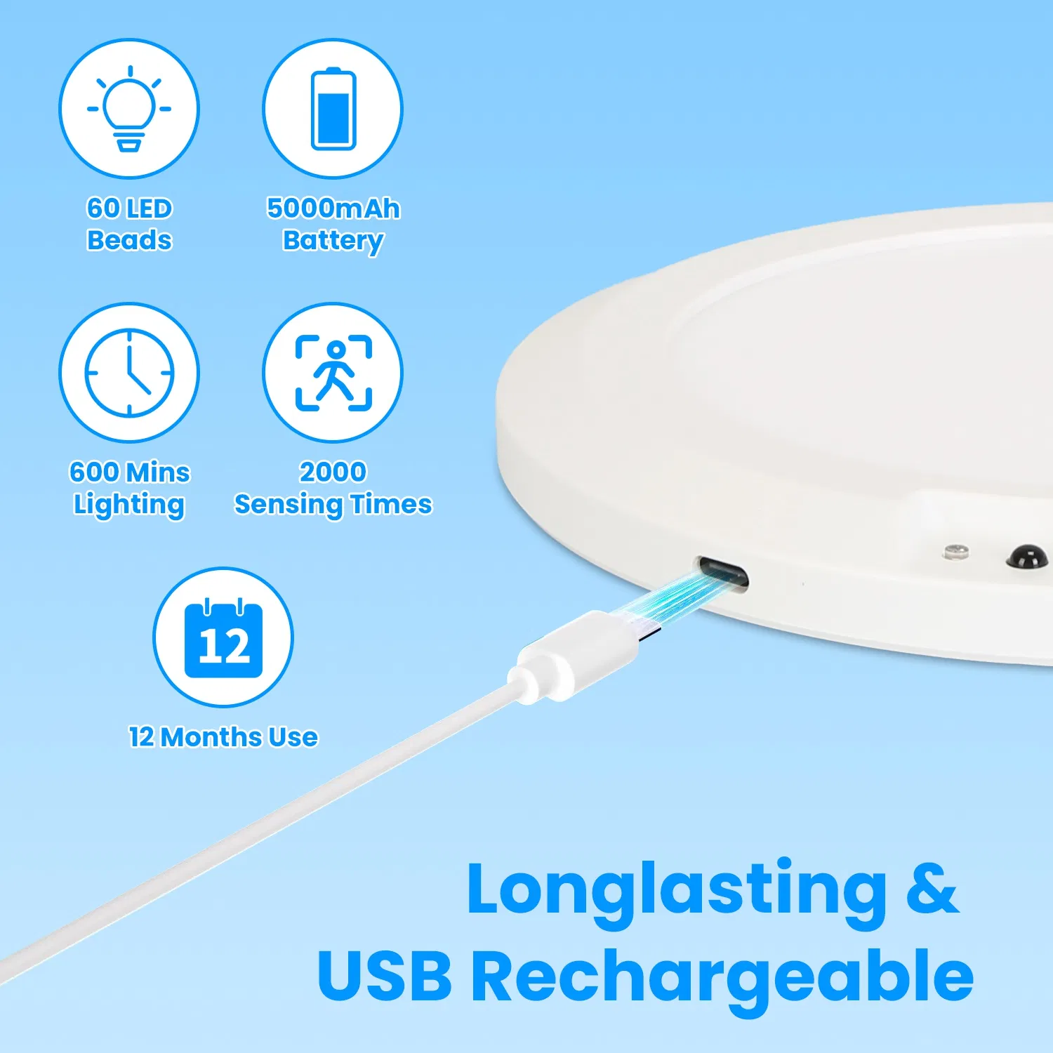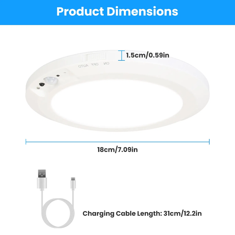 *Long-lasting & USB Rechargeable*:Built in a 5000mAh rechargeable battery,our wireless ceiling light can run up to 600 minutes for continuous lighting and sense 2000 times. After fully charged for 6 hours,it is capable of 12 months’ normal use.