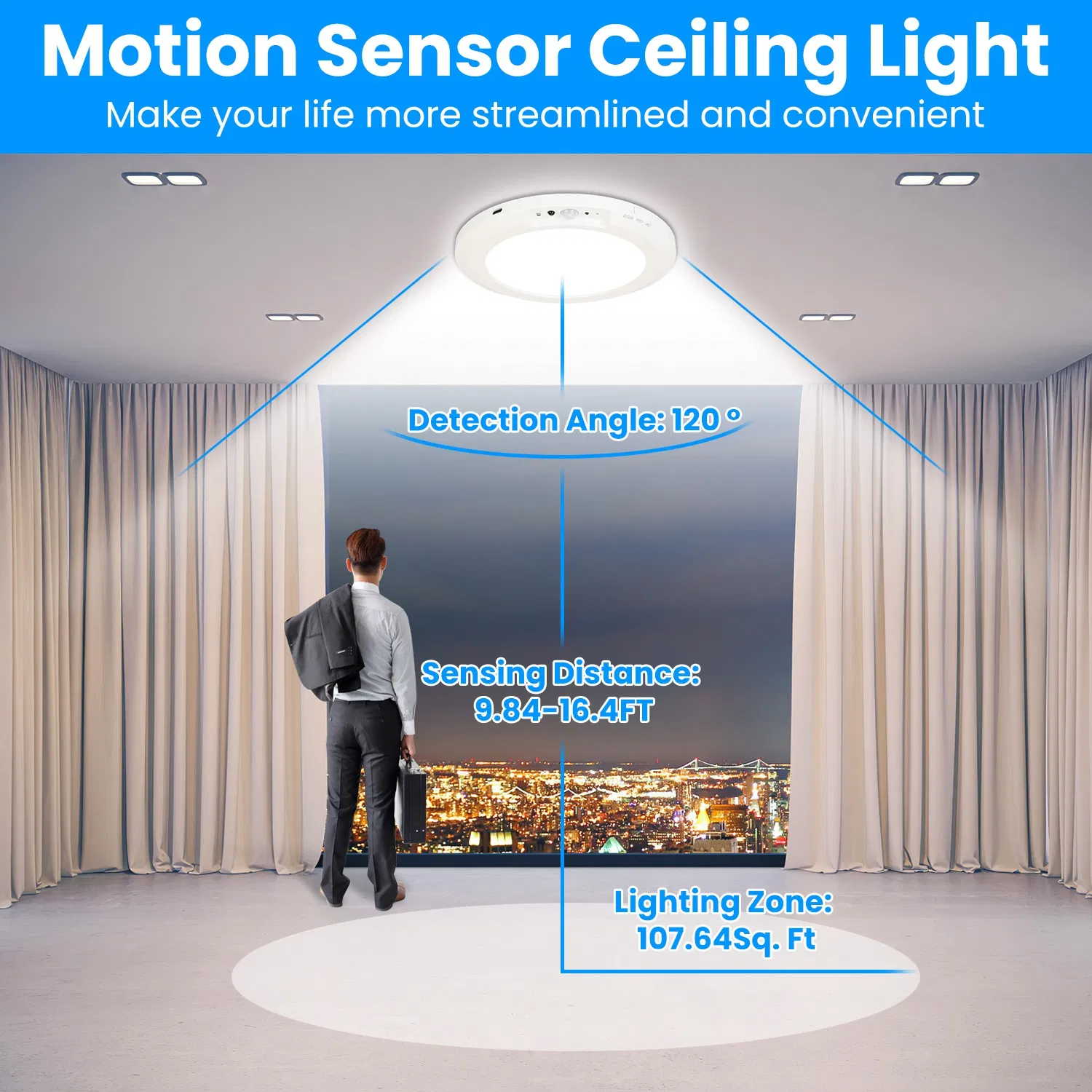 *Motion Sensor Light with 3 Modes*:With 3 lighting modes(Constant On Mode/Night Sensing Mode/Daytime Sensing Mode),our motion sensor ceiling light can fully satisfy your diverse lighting requirements in daily life. The embedded PIR sensor features 120 ° detection angle and 9.84-16.4ft sensing distance,providing you with a large lighting area of 107.64Square Feet.