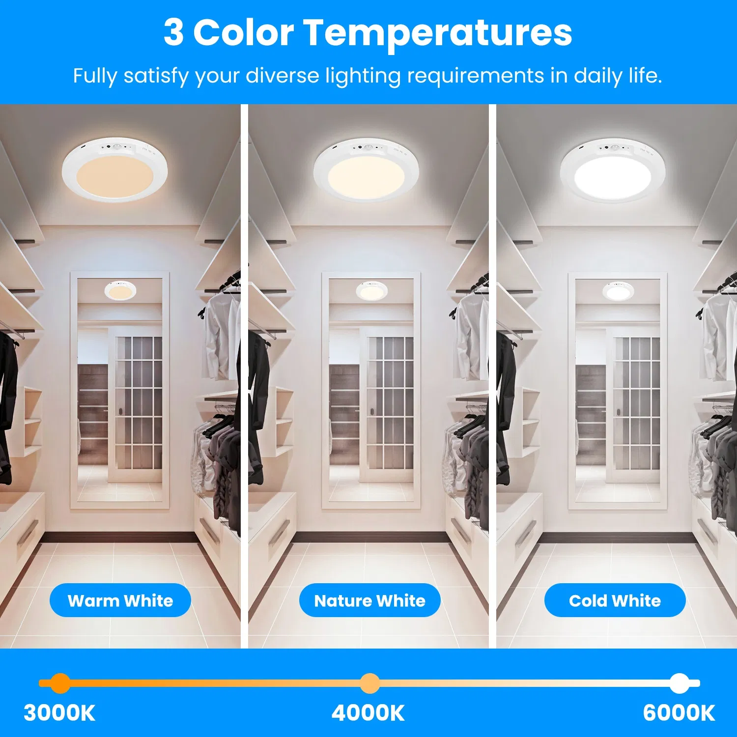 3 Color Temperatures: 4000K Natural White, 3000K Warm White, 6000K Cold White