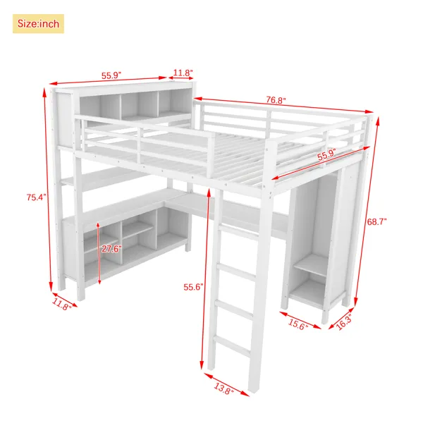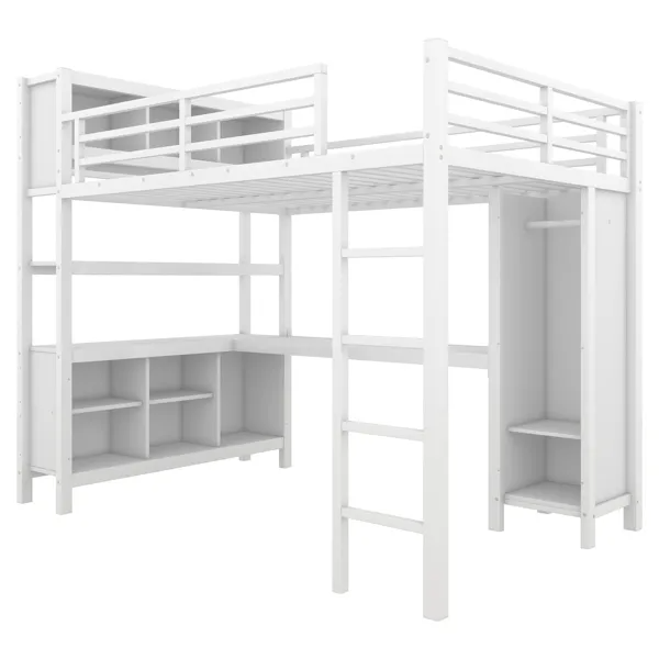 Home > Metal Loft Bed With Wardrobe And L-shaped Desk, Full Size Loft Bed With Storage Cubes And Shelves, Heavy Duty Loft Bed For Kids Teens Adults, Whi