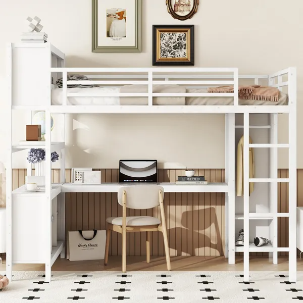 • Full Loft Bed with Wardrobe and Desk: This metal loft bed has a cozy sleeping space, a spacious and practical L-shaped desk that can be used as a workbench or reading area, and the wardrobe can provide a great place for your everyday clothes.