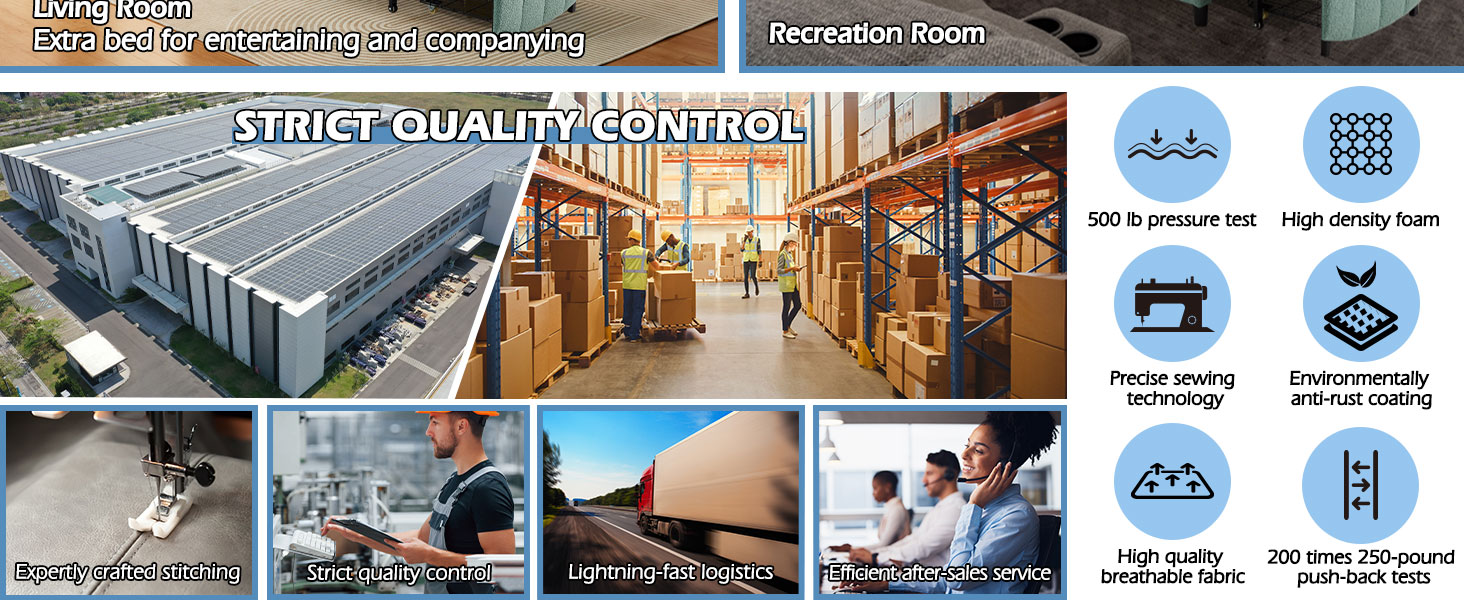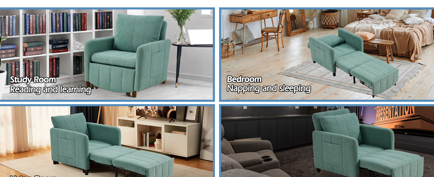 Versatile 4 - in - 1 convertible sofa bed, blending comfort and space - saving ingenuity. Perfect for living rooms, home offices, or compact spaces, it smoothly transitions between a chair, lounge, recliner, and an extended bed (15.8” longer than ordinary ones), catering to your relaxation, work, or sleeping requirements.