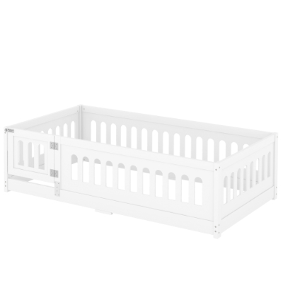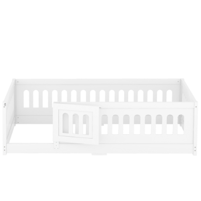 Product Name:Twin Size Floor Bed with Heightened Safety Guardrails and Door, Solid Wood Bedframe with Rails for Girls, Boys, Teens, Child Bedroom, Kids Playroom, No Slats Included, White